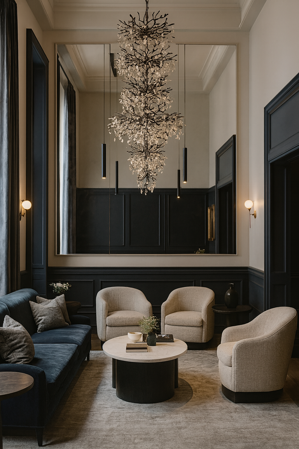 Le lustre Crystal Cascade est une pièce spectaculaire conçue pour sublimer les espaces à grande hauteur sous plafond. Sa structure aérienne en métal noir, inspirée de branches naturelles, est ornée de cristaux transparents suspendus en cascade, créant un effet visuel majestueux et raffiné.