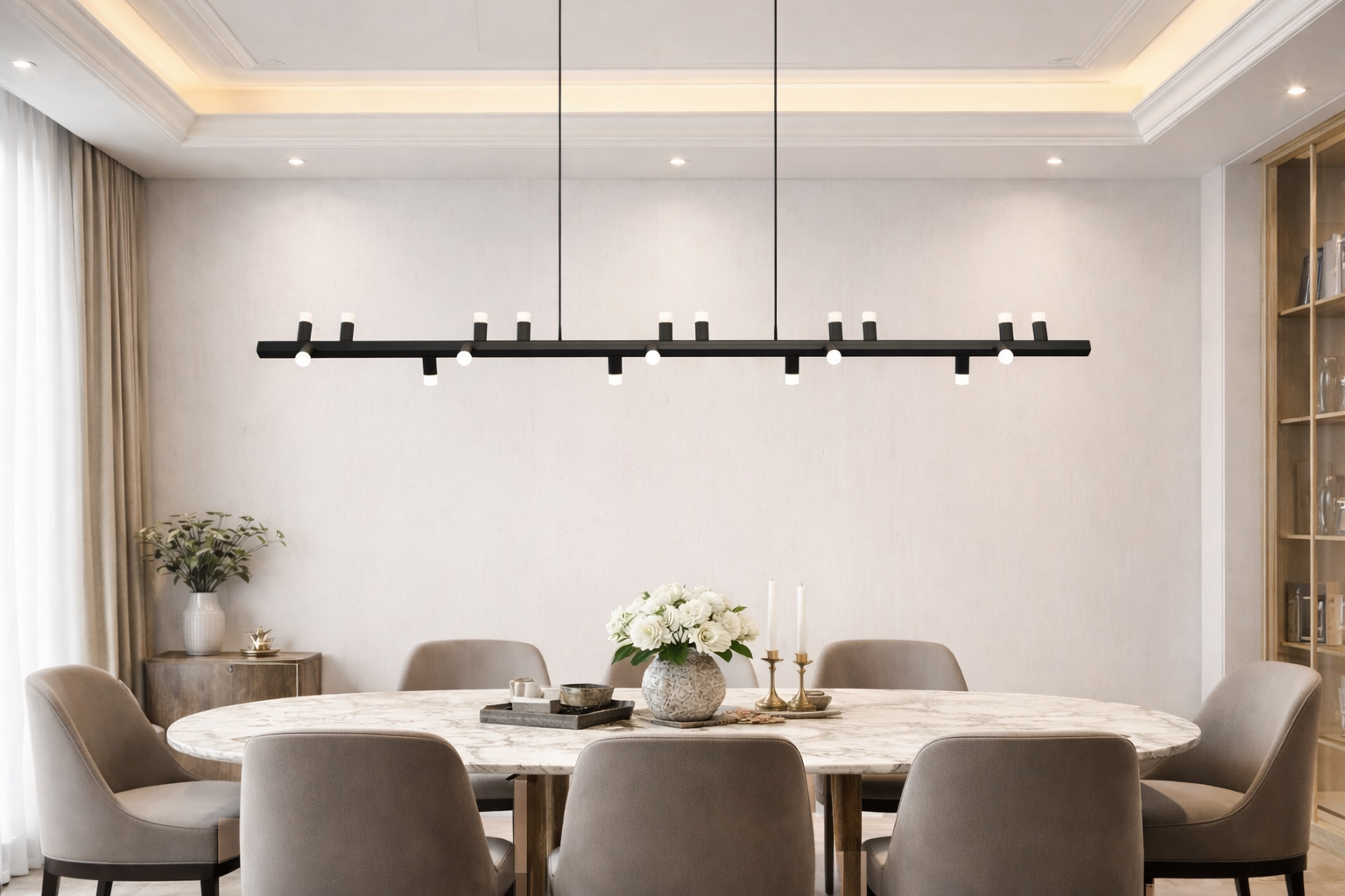 Le lustre Linéa séduit par son design minimaliste et contemporain. Sa structure linéaire noire mate, ponctuée de sources lumineuses orientables, apporte une lumière homogène et raffinée. Parfaitement adapté aux tables de salle à manger, îlots de cuisine ou espaces de réception, il s’intègre harmonieusement dans des intérieurs modernes, chics et épurés. Son esthétique sobre met en valeur les volumes tout en créant une ambiance chaleureuse et sophistiquée.