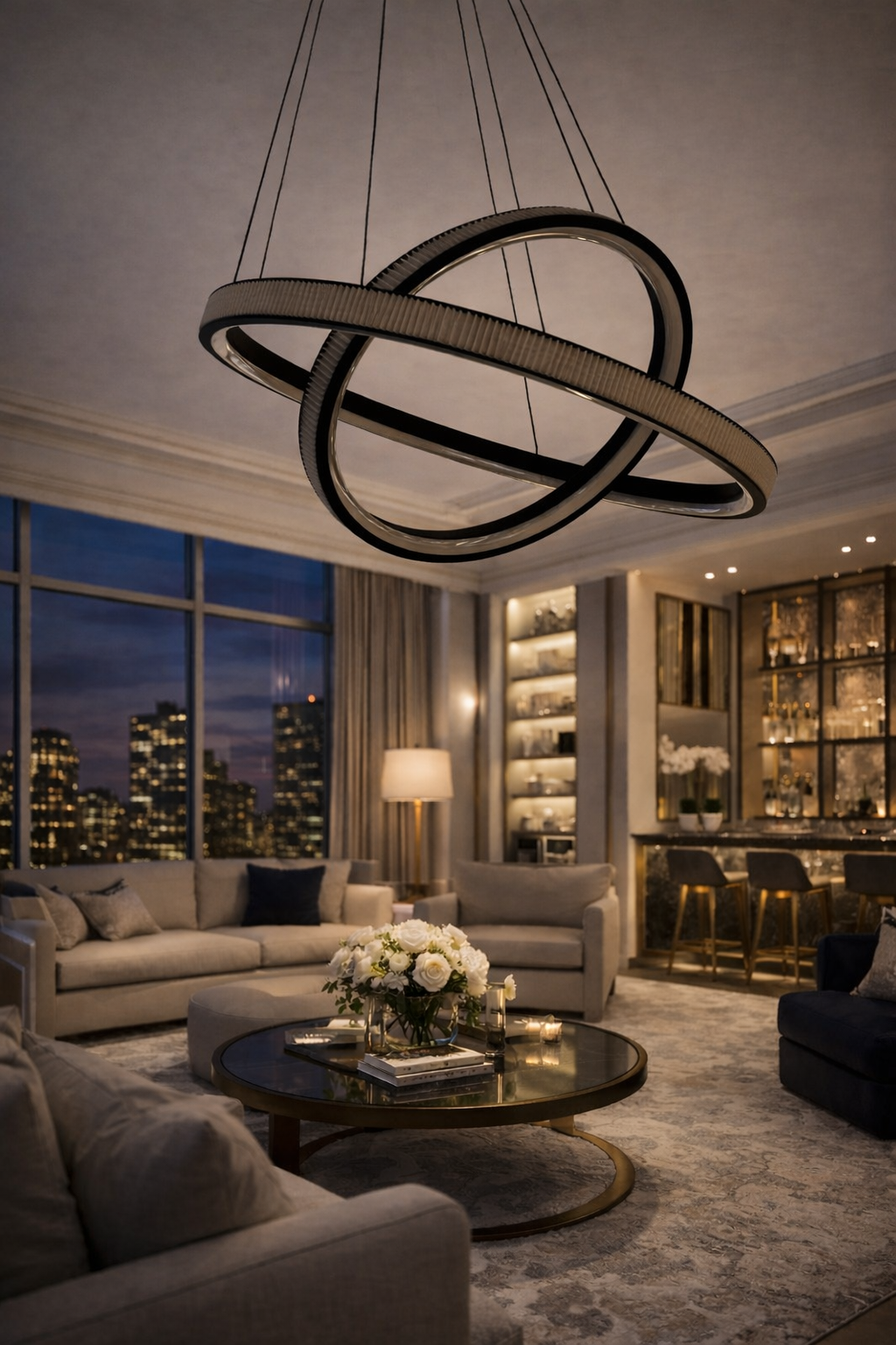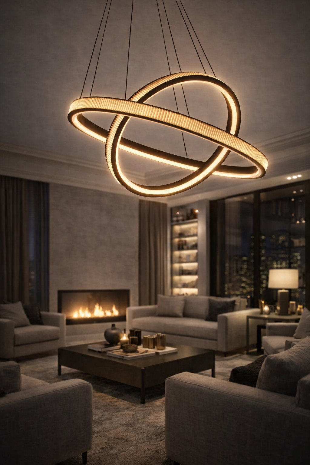 Le lustre Orbite Prestige incarne l’élégance moderne à travers ses anneaux lumineux entrelacés, suspendus avec légèreté. Son éclairage LED intégré diffuse une lumière chaude et enveloppante, créant une ambiance sophistiquée et chaleureuse. Grâce à son design aérien et sculptural, il devient un véritable élément architectural, idéal pour sublimer un salon contemporain, une salle à manger haut de gamme ou un espace de réception luxueux.
